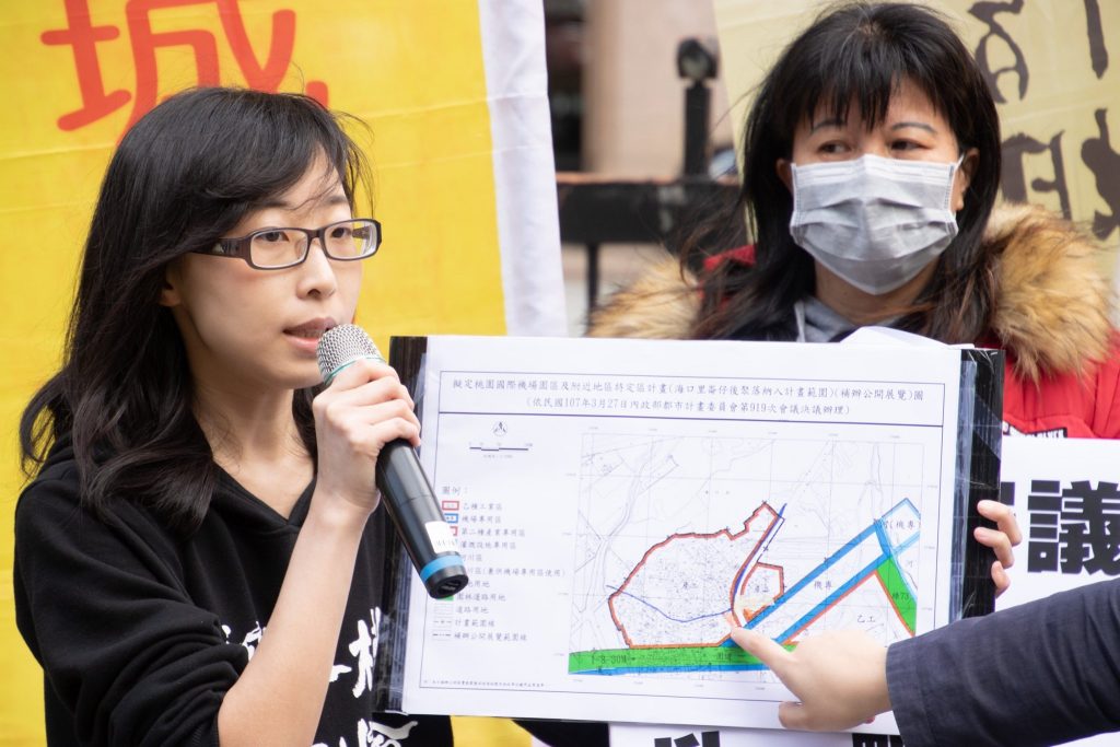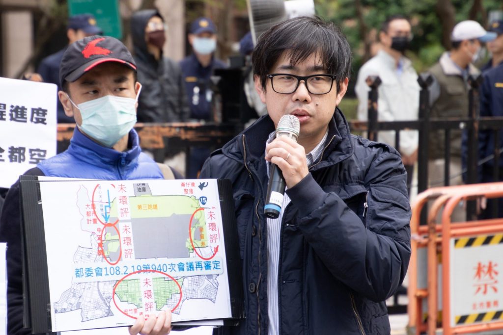 環境權保障基金會研究員許博任呼籲交通部林佳龍部長及桃園市鄭文燦市長應主動聲明補辦開發範圍內其他開發行為的個案環評再啟動徵收(台權會何宇軒拍攝)