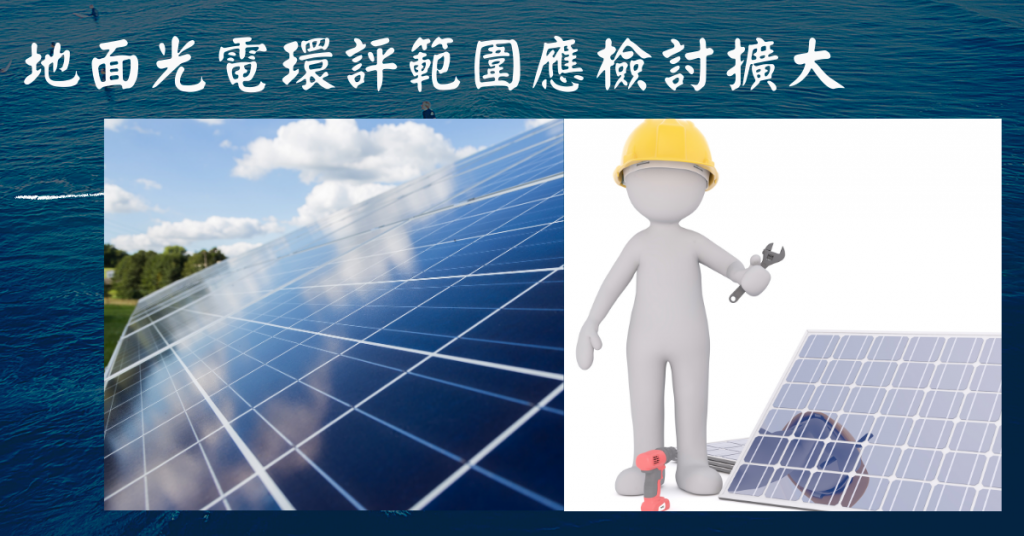 為達成2025年再生能源達總發電量20%的目標,政府積極推動能源轉型,發展綠能產業。然而,沒有任何機制是完美無缺的,無論是光電或風力發電,仍有它發展上對環境生態的影響衝擊,依據《環境影響評估法》第5條第1項第10款規定「核能及其他能源之開發……之興建」對環境有不良影響之虞者,應實施環評。所以,太陽能光電產業如對環境有不良影響之虞者,依法有實施環評的必要。但依目前標準,太陽能光電開發,只有在重要濕地進行時,需要實施環評。