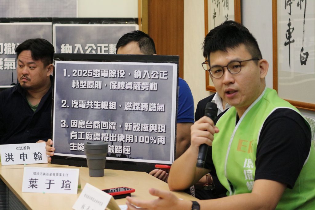 林彥廷說明,現行減碳政策(以2025年麥寮電廠3部燃煤機組除役為例),未納入公正轉型原則,以輔導高碳排產業勞工獲得有尊嚴的綠色工作,保障其工作權,否則未來製造與能源部門的減碳只會越來越困難,甚至引發2016年彰化台化廠因生煤許可證的關廠爭議,讓環保和勞工站在對立面,最終勞工無法一同支持台灣氣候治理政策。
