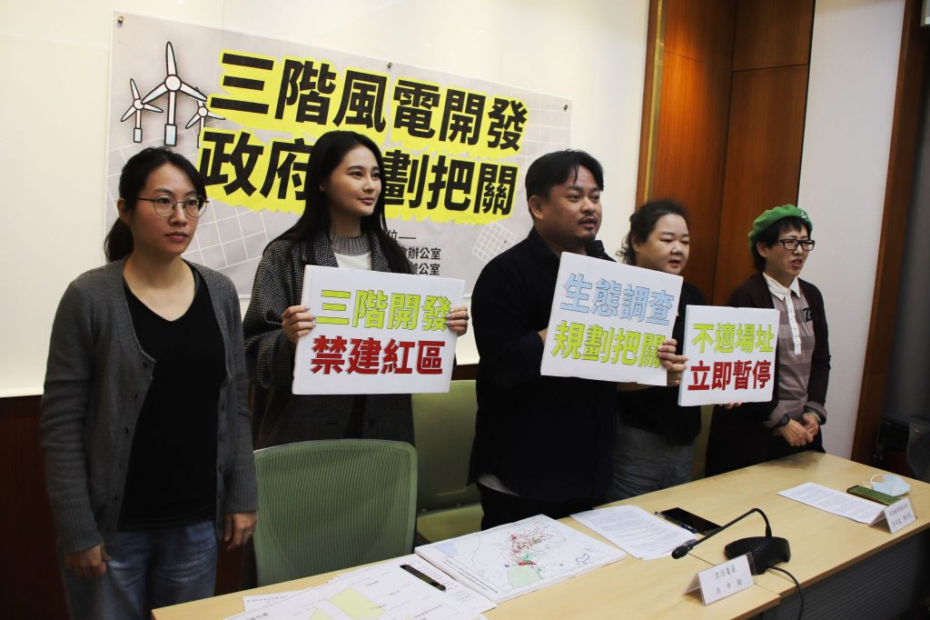 立法委員洪申翰、賴品妤和環境權保障基金會、綠色公民行動聯盟及台灣再生能源推動聯盟召開記者會,呼籲離岸風電開發需考慮漁場、生態、環境等各面向。