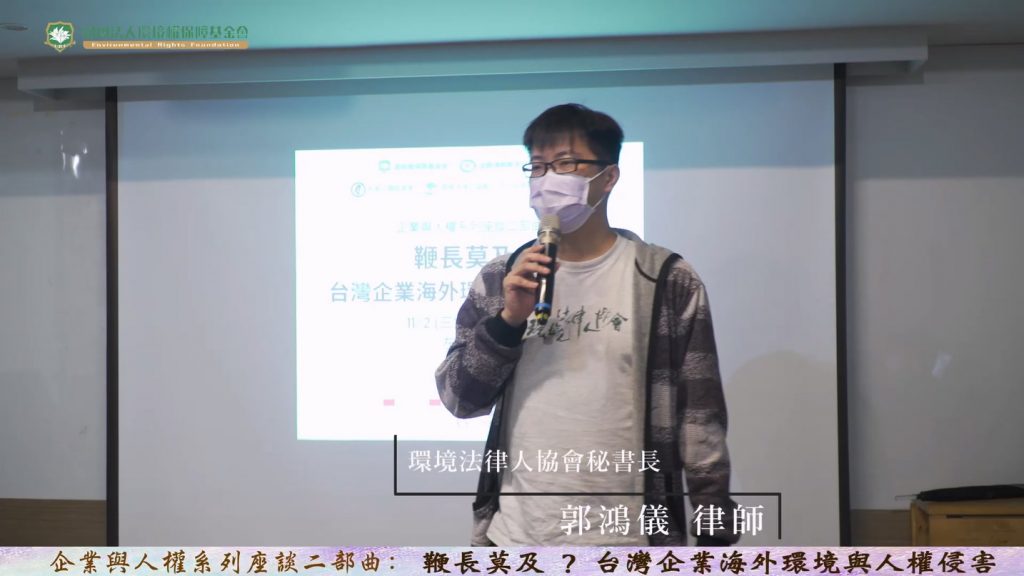 環境法律人協會秘書長郭鴻儀主要以台塑越鋼案,討論人權侵害後的司法救濟。他說,台塑從2008開始在越南河靜發展煉鋼廠,2016年4月,當地大量魚群死亡,亦有潛水夫潛水後死亡,後來發現海水裡面有有毒化學成分,而當地唯一有這種化學成分的,只有台塑鋼鐵廠的廢棄物。台塑一開始不承認,地方開始抗爭,國會接著展開調查,台塑才公開承認意外排放廢水至海中,並承諾賠給越南政府五億美金。爾後越南政府態度開始轉變,變成保護台塑的角色。