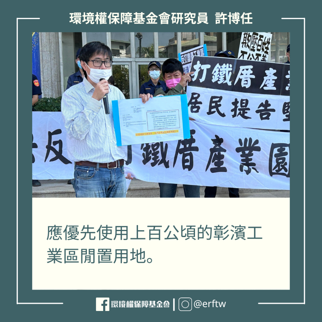 黃馨雯進一步指出,其實打鐵厝產業園區可供製造業進駐的用地面積,只有4.5295公頃,可以容納的廠商數量大概6、7家,對產業的發展和用地提供非常有限。而依〈非都市土地開發審議作業規範〉總編第3點之2第1項規定,工業區的開發應該先使用閒置用地,依據彰化縣政府自己提出的資料,彰濱工業區閒置用地就有10公頃,另外我們也整理,其他可供租售但未租售地設廠用地面積達115公頃,顯然足夠因應打鐵厝產業園區預計提供的4.5公頃用地。彰化縣政府不去使用這些閒置用地,卻要跑來我國重要的農業發展區興建產業園區,不僅政策上有問題,法律上也顯然有違誤因此環權會在上週,已經協助居民正式的向台中高等行政法院提起訴訟,以捍衛居民權利,並期待撤銷違法且不當的打鐵厝產業園區開發計畫。