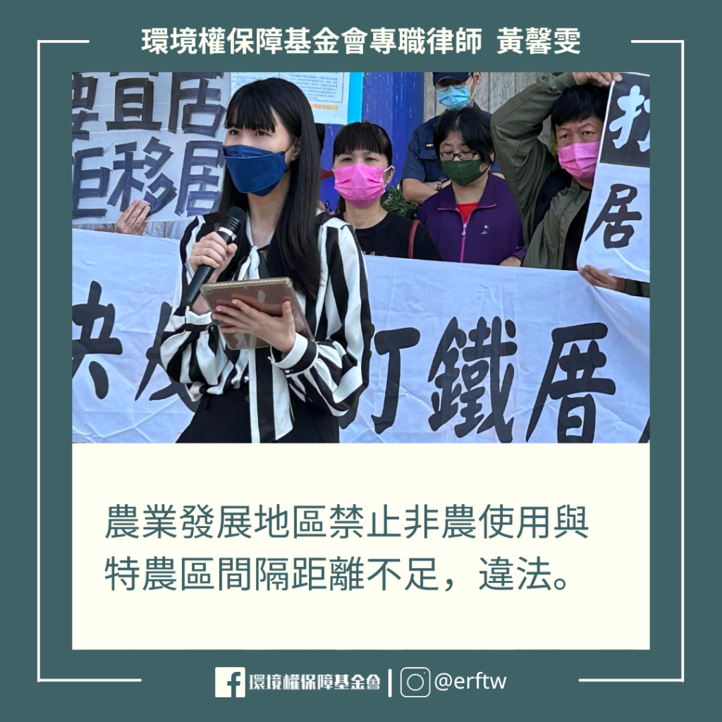環境權保障基金會專職律師黃馨雯表示,打鐵厝產業園區就是一個選址錯誤,侵害農地的開發案。打鐵厝產業園區預定地,目前在彰化縣國土計畫是劃為「農業發展地區」,根據全國國土計畫及彰化縣國土計畫的土地使用管制規則,農業發展區,除了符合特定的事由以外,否則只能作為農業使用。打鐵厝產業園區不符合任何一項事由,卻想要強行開發,已屬違法。不只產業園區的預定地是農業發展地區,產業園區的周邊也是農1、農2,及區域計畫法下的特農區,依據〈非都市土地開發審議作業規範〉第8編第7點,產業園區應至少和特農區相隔30公尺,其中至少要有20公尺的綠帶,但依照通過的計畫書內容,產業園區卻只和特農區相隔26公尺,且只有10公尺的綠帶,這顯然已經違反非都作業規範。