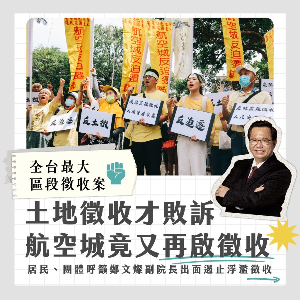 【聯合新聞稿】土地徵收才敗訴,航空城竟又再啟徵收 居民、團體呼籲鄭文燦副院長出面遏止浮濫徵收
