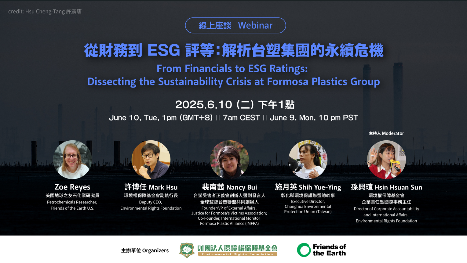 新聞稿, 最新消息 【報告發表新聞稿】從財務到 ESG 評等:解析台塑集團的永續危機─新報告揭露台塑集團財務美化與失靈的 ESG 評等機制//New Report Exposes Formosa Plastics’ Problematic Masking Strategy & Flawed ESG Ratings By 環權會 2025 年 6 月 10 日 330 0 Comments Read More