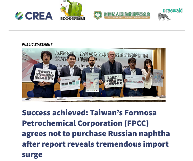 Success achieved: Taiwan’s Formosa Petrochemical Corporation (FPCC) agrees not to purchase Russian naphtha after report reveals tremendous import surge