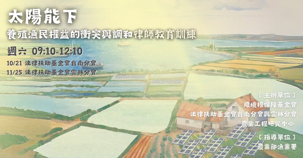 太陽能下漁電共生與漁民權益的衝突與調和律師教育訓練 #台南場 邀請關心漁電的律師朋友,立即報名https://erf.pse.is/5agh7m 漁電如何共生?
