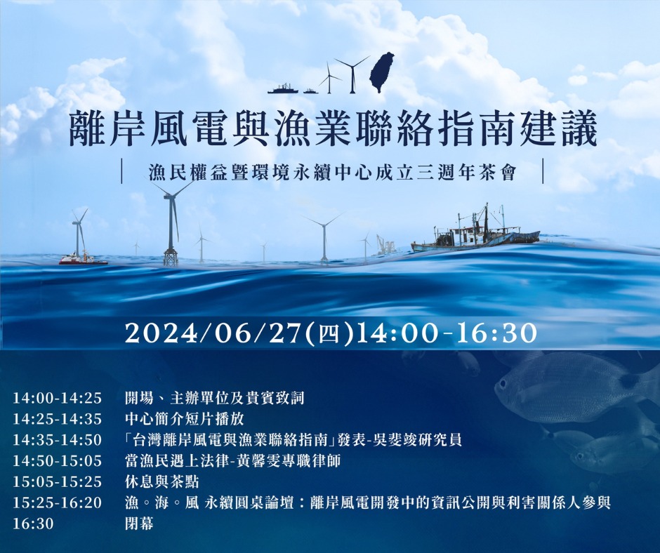 🐟🦐🦀漁環中心成立三週年啦!🦀🦐🐟 台灣離岸風電與漁業聯絡指南建議發表暨漁民權益暨環境永續中心成立三週年茶會 即刻報名➡️ https://forms.gle/