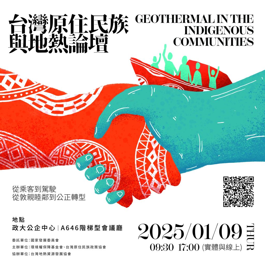 台灣原住民族與地熱論壇 從乘客到駕駛-從敦親睦鄰到公正轉型 時間:2025年1月9日星期四(0930-1700)(實體與線上) 地點:政大公企中心A646階梯型