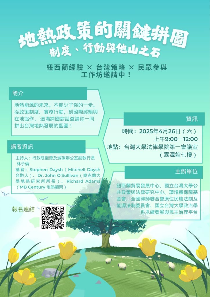 地熱政策的關鍵拼圖 制度、行動與他山之石紐西蘭經驗 × 台灣策略 × 民眾參與|工作坊邀請中!地熱能源的未來,不能少了你的一步。從政策制度、實務行動,到國際經