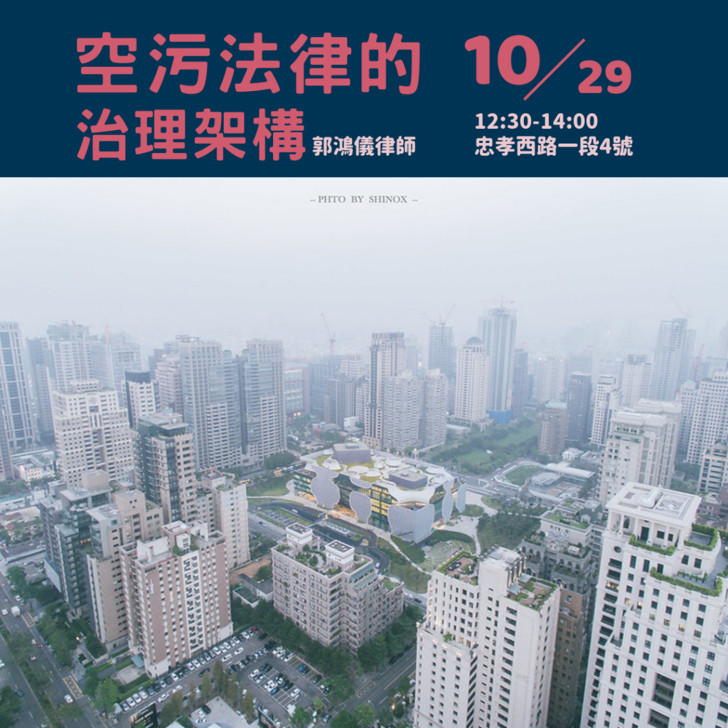 主題:空污治理的法律架構 時間:108.10.29(二)12:30-14:00 地點:律師公會全國聯合會(台北市忠孝西路一段4號) 主講:郭鴻儀律師 空氣污染,