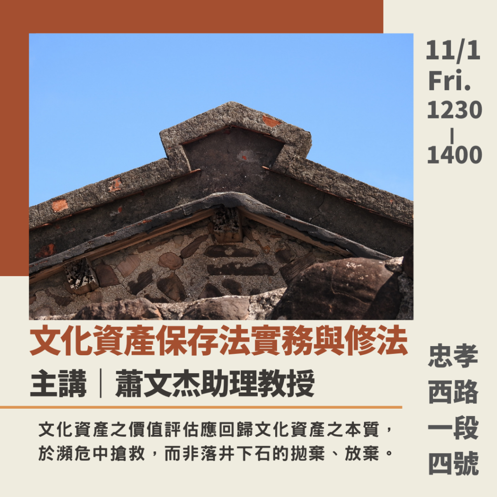 主題:文化資產保存法實務與修法 時間:108.11.01(五)12:30-14:00 地點:律師公會全國聯合會(台北市忠孝西路一段4號) 主講:蕭文杰 助理教授