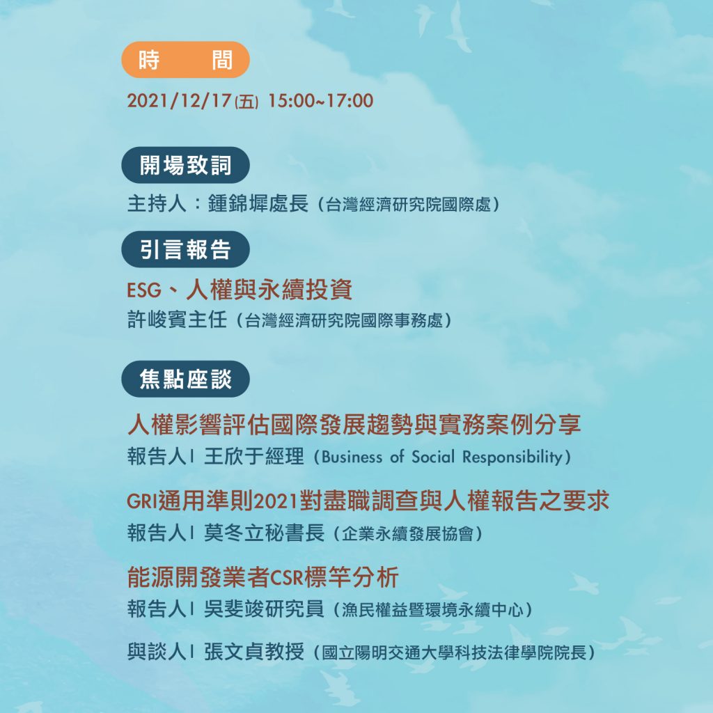 一、人權影響評估國際發展趨勢與實務案例分享 王欣于經理,Business of Social Responsibility 二、GRI通用準則2021對盡職調查與人權報告之要求 莫冬立秘書長,企業永續發展協會 三、能源開發業者CSR標竿分析 吳斐竣研究員,漁民權益暨環境永續中心 與談人 張文貞教授,國立陽明交通大學科技法律學院院長 |