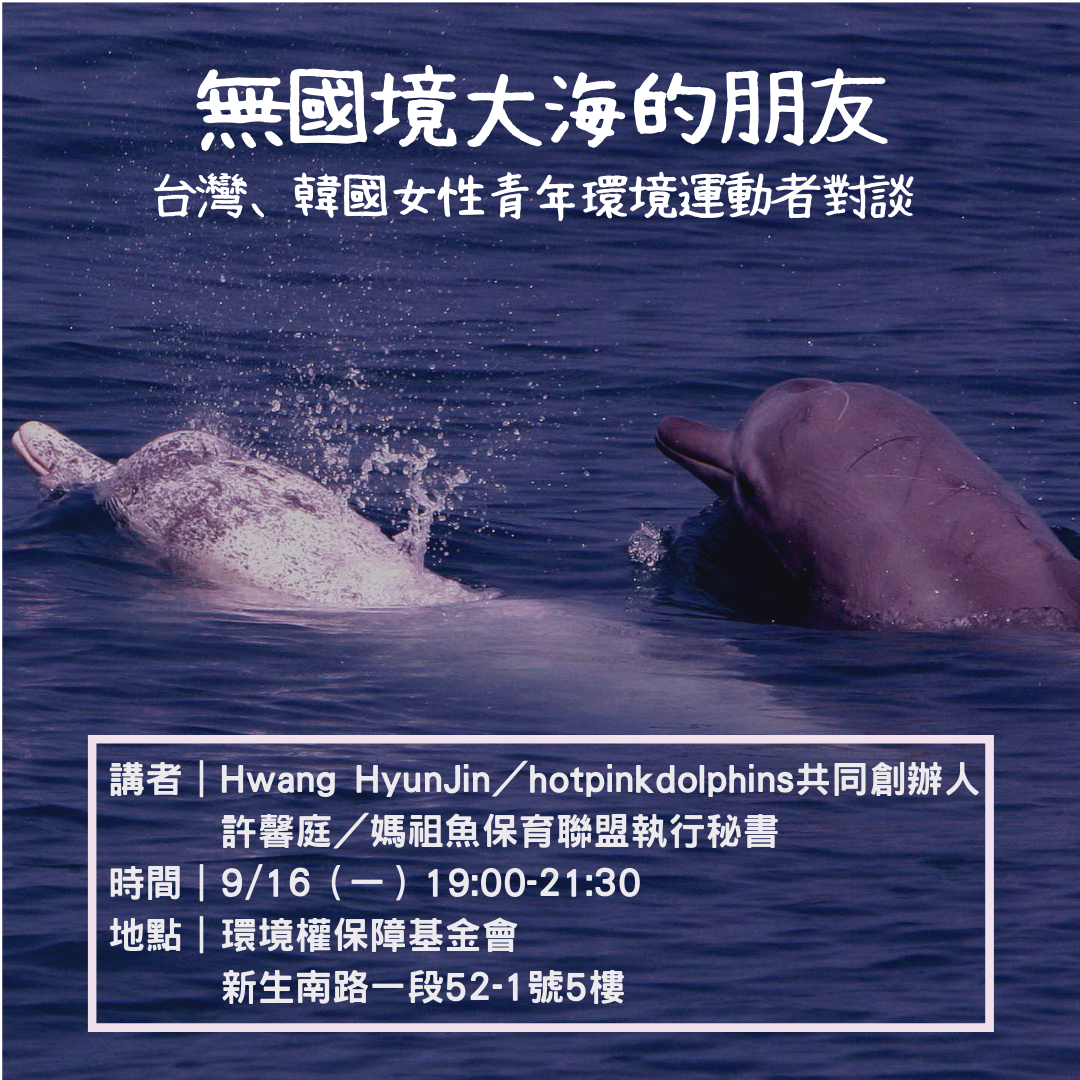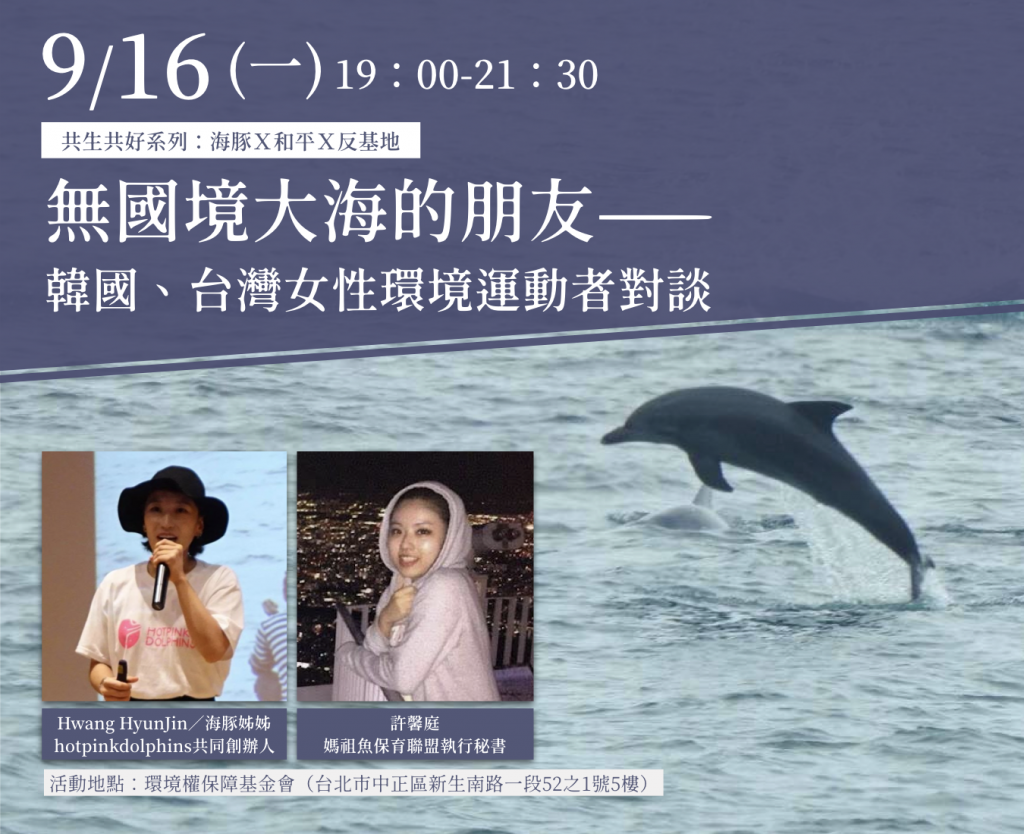 這場講座,我們邀請韓國唯一專注鯨豚保育的團體Hotpinkdolphins共同創辦人Hwang HyunJin與媽祖魚保育聯盟執行秘書許馨庭,請他們分別向大家分享接觸環境議題、踏上保育海豚之路的契機,以及面對種種不利海豚的環境,如何爭取更多空間甚或復育?以及怎麼向大眾推廣海豚保育的相關工作。