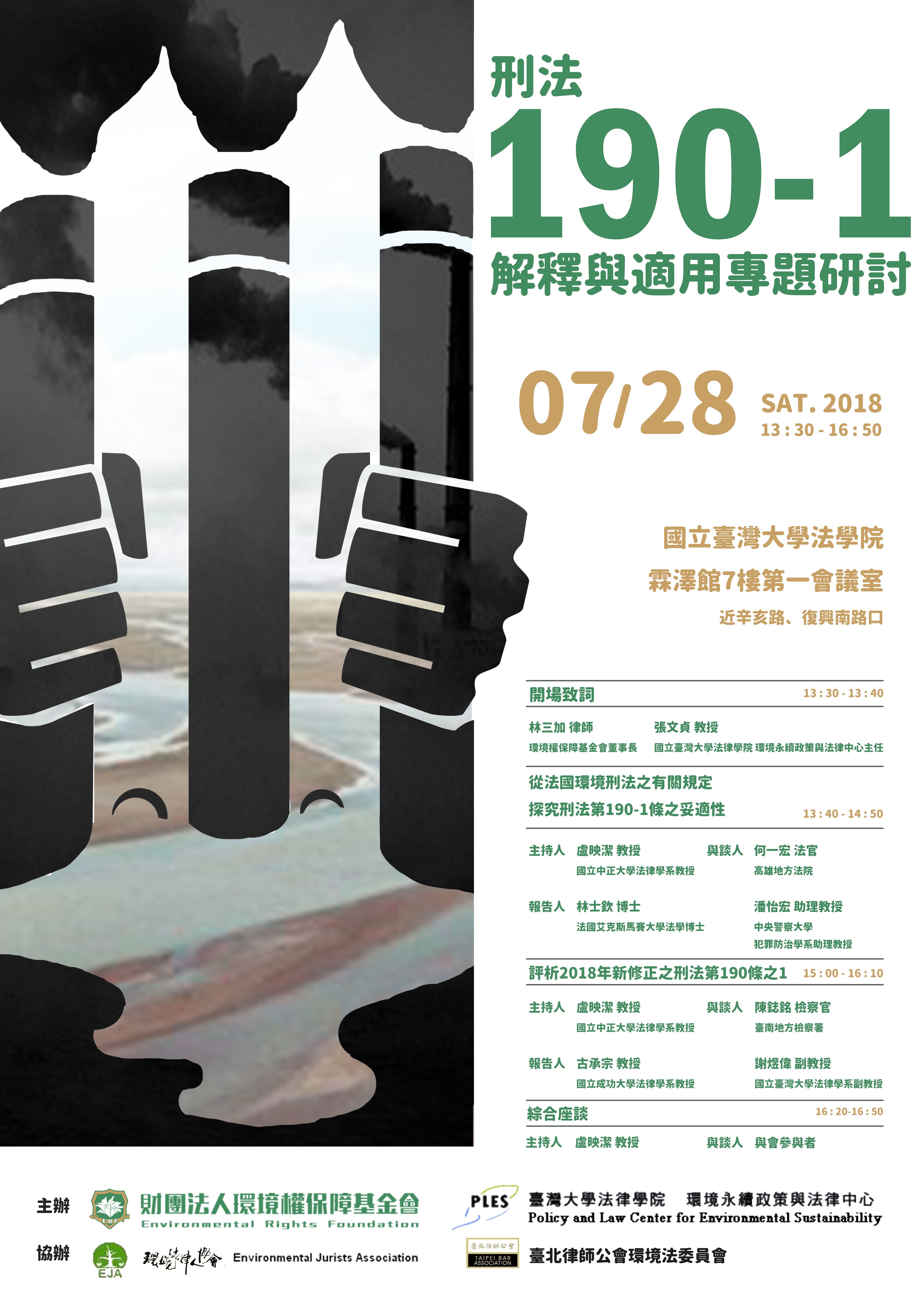 刑法第190條之1修正案原為落實2017年司改國是會議有關「環境案件司法程序檢討」 ,就「重大環境犯罪」朝向「抽象危險犯」修正 。將原條文中「致生公共危險」的文字予以刪除,減輕未來檢察官偵辦環境案件舉證「致生公共危險」的困難,並且增列同條過失犯以及未遂犯等處罰規定。條文修正後文字,將可能導致刑罰對象過大的問題,且對於既有污染環境法規,已明確規定各類違反行政義務所可能遭受行政罰或行政刑罰的體系,造成法適用上的紊亂。對此,環境權保障基金會等團體,希望以舉行研討會方式,釐清刑法第190條之1的法適用爭議,以及未來該條文與既有行政法規競合衝突的解決問題。以利未來實務工作者能明確掌握刑法第190條之1之解釋適用。