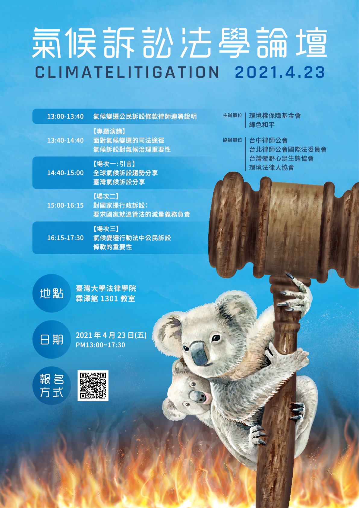 邀請您4/23(五)下午,一同和我們思考台灣推動氣候訴訟的各種可能性,也誠摯邀請您協助分享活動資訊,能讓更多人了解在臺灣提起氣候訴訟的重要性。