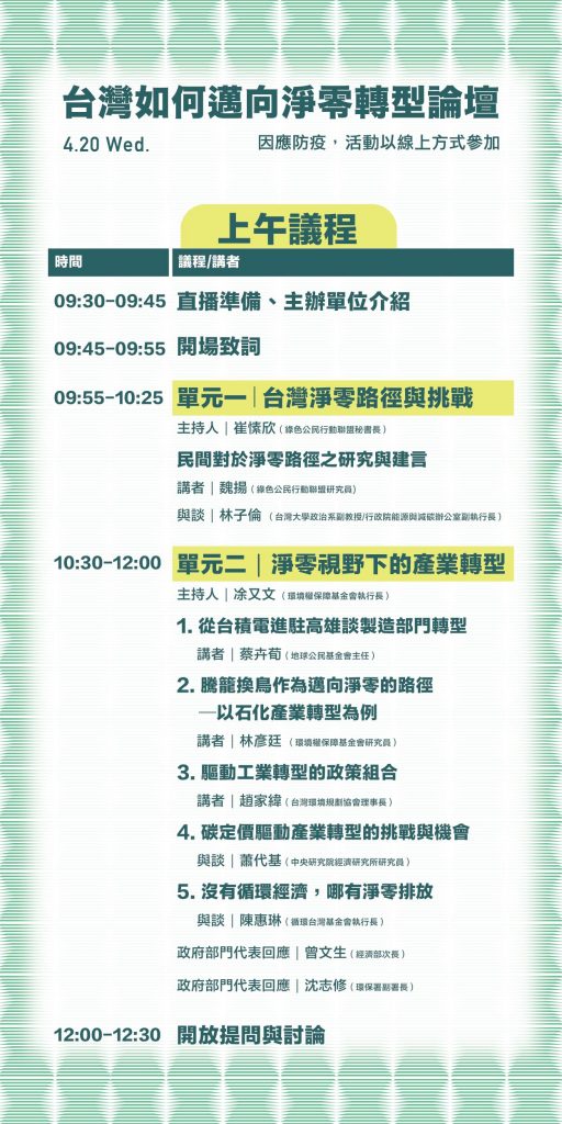 為了試著回答這些大哉問,眾多長期積極投身於台灣能源轉型、氣候行動的公民團體一起籌備了這場「台灣淨零,尋路共行:台灣如何邁向淨零排放」論壇,探討「台灣淨零路徑與挑戰」、「淨零視野下的產業轉型」、「環境共融的再生能源發展策略」與「彈性與韌性的分散式電力系統」等四大主題,並邀請NGO、專家學者、立委、政府代表參加,期待可以一起探尋未來方向,共同踏出邁向淨零的第一步。