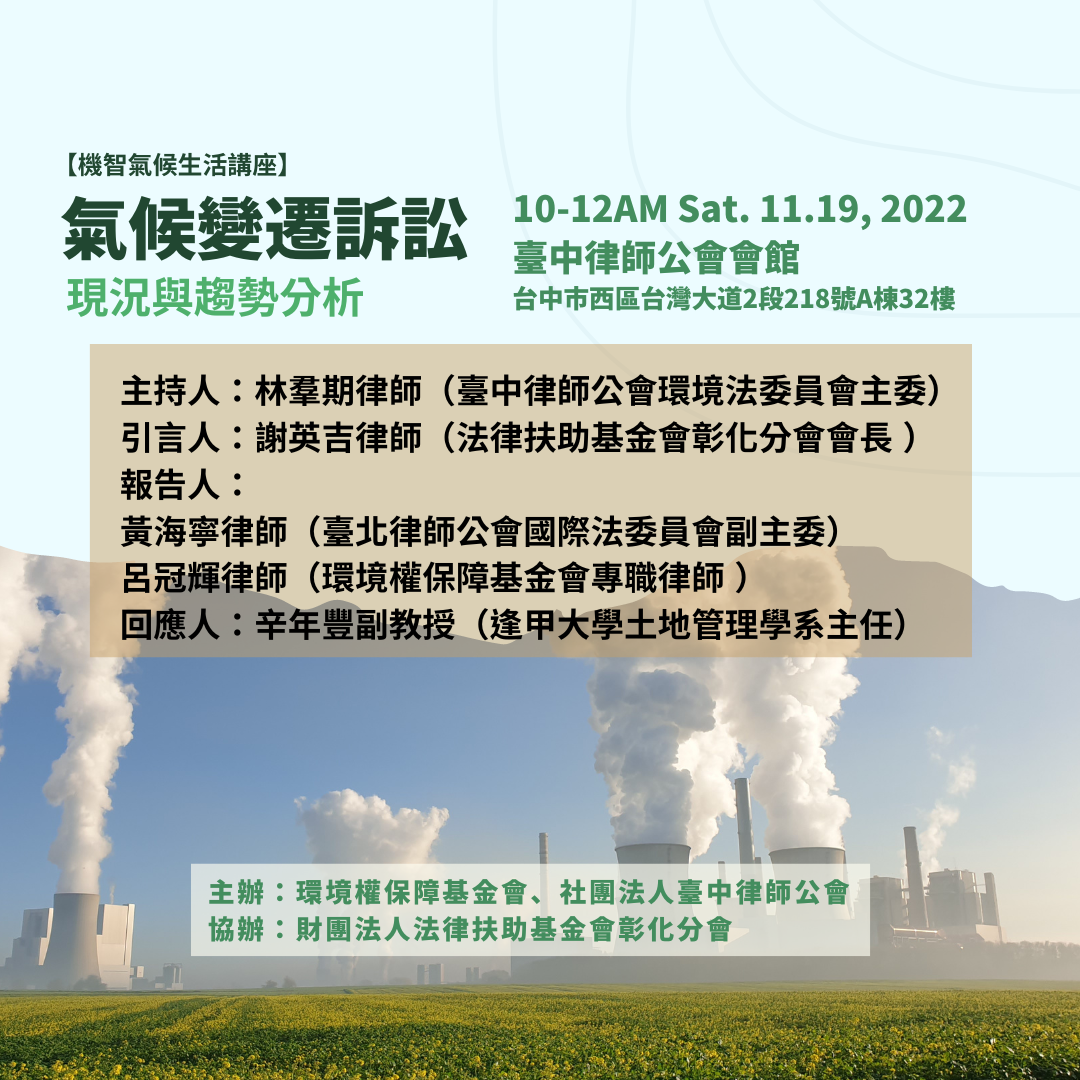 隨著各國政府陸續宣示進入氣候緊急狀態,各國採取更積極的氣候變遷行動方案,氣候訴訟在國際間蓬勃發展,相較之下,臺灣法院對於氣候變遷的討論顯得較少,為此,環境權保障基金會與臺中律師公會還有法律扶助基金會彰化分會特別邀請長期研究與關注環境法律領域的逢甲大學土地管理學系主任辛年豐副教授、台北律師公會國際法委員會副主委黃海寧律師,以及環境權保障基金會專職律師呂冠輝,分享國際氣候變遷法與全球氣候訴訟最新趨勢。
