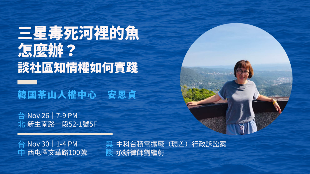 這系列講座邀請韓國茶山人權中心工作者安恩貞向我們分享居民和市民團體如何在污染事件後團結,以及韓國化學物質管理及社區知情權入法的狀況。