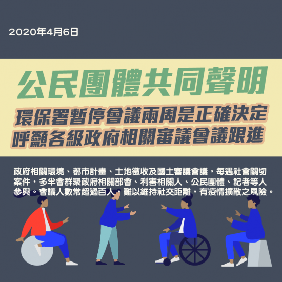 環保署暫停環評會議兩週是正確決定,呼籲各級政府相關審議會議跟進,以防範武漢肺炎(新冠肺炎)疫情擴散風險 環境權保障基金會、地球公民基金會等23個環境團體,3/2