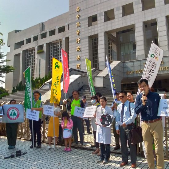 台中各關注空污議題之公民團體與環權會,今天齊集台中高等行政法院前,就臺中市政府環保局主責的環評委員會在2017年7月24日做出的審查結論,讓中龍鋼鐵可以用一張「