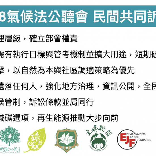 民間團體回應12/28政府公布2030減碳目標與12項關鍵戰略共同聲明 「2050年淨零排放」已經是臺灣當下最重要的長期政策目標之一,為避免氣候變遷的各