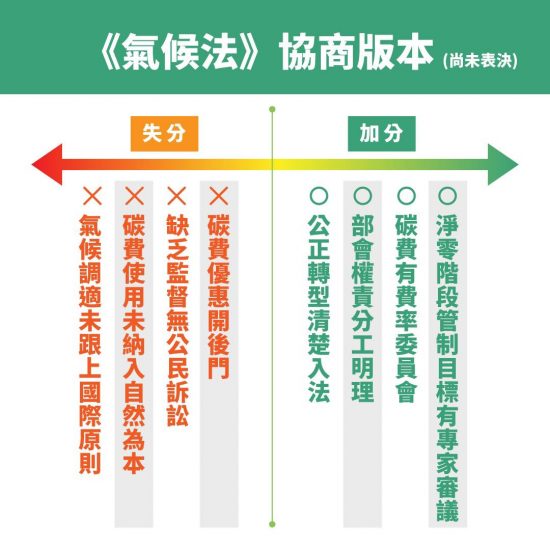 經過連續兩日黨團協商,加上委員會超過十小時的討論,《溫室氣體減量及管理法》(簡稱氣候法)黨團協商,在立法院長游錫堃的主持下告一段落。氣候法修法成功在即,長期